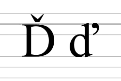 The grapheme Ď (minuscule: ď) is a letter in the Czech and Slovak alphabets used to denote /ɟ/, the voiced palatal plosive (precisely alveolo-palatal), a sound similar to British English d in dew.[1][2] It was also used in Polabian. The majuscule of the letter (Ď) is formed from Latin D with the addition of a háček; the minuscule of the letter (ď) has a háček modified to an apostrophe-like stroke instead of a wedge. When collating, Ď is placed right after regular D in the alphabet.