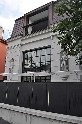 The simple but dynamic facades are complemented with the allegoric figures of painting and sculpture, placed in semi-circular niches Placed at the prominent part of the facade. These figures symbolize the artist's house.