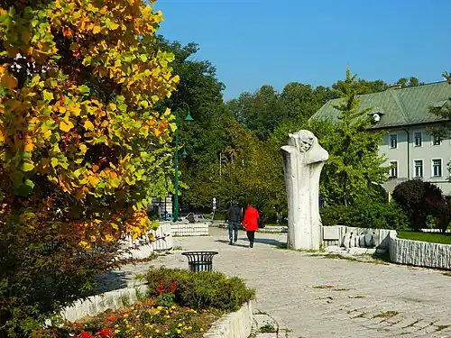 In Sarajevo, Alipaša Street was named after him from 1945 to the 1990s. His name was also given to the Bosnian Cultural Center, the main cinema hall in post-war Sarajevo. A memorial park with a statue was built nearby Alipaša Street in 1973, on a project by Ljubomir Denković, professor at the Academy of Art in Novi Sad, in a style that art historian and museum advisor Miloš Arsić called sculptures of natural vitalism. The memorial park was renamed in 2017 in honour of the 1st Corps of the RBiH Army.[1]