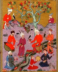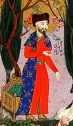 ![]() Contemporary portrait of Gazy II Giray ("غازی گيرای"), standing in captivity with Safavid Hamza Mirza. Secaatname (1598) | |