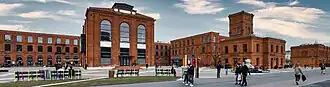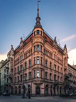 The infrastructure and edifices of Łódź were built at the expense of industrialists and business magnates, chiefly Karl Wilhelm Scheibler and Izrael Poznański, who sponsored schools, hospitals, orphanages, and places of worship.[39] From 1872 to 1892, Poznański established a major textile manufactory composed of twelve factories, power plants, worker tenements, a private fire station, and a large eclectic palace.[40] By the end of the century, Scheibler's Księży Młyn became one of Europe's largest industrial complexes, employing 5,000 workers within a single facility.[41] The years 1870–1890 saw the most intense industrialisation,[42] which was marked by social inequalities and dire working conditions.[43] Łódź soon became a notable centre of the socialist movement and the so-called Łódź rebellion(pl) in May 1892 was quelled by a military intervention.[43]