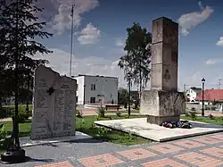 During the Invasion of Poland by the Germans in World War II, Łaszczów saw Polish–German fighting. Afterwards it was occupied by Germany until 1944. It was the site of two massacres of Poles, the first committed by Ukrainian nationalists on June 21, 1941, with 30 victims, and the second committed by the German Gestapo and an ethnic Ukrainian SS unit on December 25, 1942 with 75 victims.[2] The 1,500–2,500 Jews from the town were transported to the Belzec extermination camp on May 17, 1942.[3] In June 1944, Łaszczów was burnt by the Ukrainian Insurgent Army.