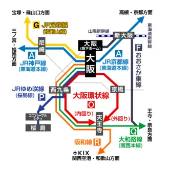 Although it is officially served by only the JR Kobe/Kyoto Lines (Tōkaidō Main Line) and the Osaka Loop Line, Ōsaka is the starting point of JR Takarazuka Line service, and serves as the terminal for trains bound for the San'in region via JR Takarazuka Line and the Hokuriku region via JR Kyoto Line, while offering connections to trains bound for Nara, Wakayama and Kansai International Airport via the Osaka Loop Line.