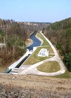 On the Malše River just above the village is the Římov Reservoir providing drinking water for large portion of the South Bohemian Region. The dam, completed in 1978, is 47.5 metres (156 ft) high and 290 metres (950 ft) long at crest. The reservoir has a volume of 33.8 million m³.[4]
