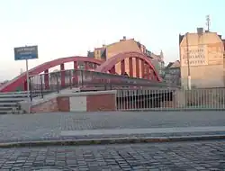 A main road runs just south of Śródka, connecting it with Ostrów Tumski and central Poznań to the west, and with the roundabout called Rondo Śródka at the district's south-east corner. This road was built in the 1960s, with the demolition of some buildings on the southern edge of Śródka. Since 7 December 2007 Śródka has also been linked with Ostrów Tumski by a footbridge ("Bishop Jordan's Bridge", Most biskupa Jordana), constructed from the former main span of the now reconstructed St. Roch road bridge which crosses the Warta further south. A bridge previously existed in this place until 1969.