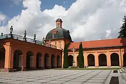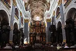 The church and convent were founded by the Society of Jesus and construction was initiated by Polish Cardinal Michał Stefan Radziejowski in 1688.[2] The temple's consecration occurred on 15 August 1693. Due to the large number of arriving pilgrims, the facility was significantly enlarged over the years and a fortified cloister with domed tower-like chapels was completed in 1708,[12] giving the overall structure a defensive appearance. The elaborate interior took over 50 years to be entirely finished and furnished. The church was further embellished with decoration through donations made by wealthy notables or pious monarchs such as Ladislaus IV, Queen Marie Casimire or Stanislaus I Leszczyński and his wife Catherine.[13]