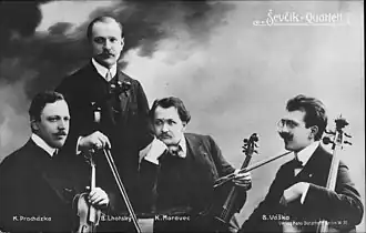 Bohuslav Lhotský, Karel Procházka and Karel Moravec were all pupils of the Czech violin teacher Otakar Ševčík (b. 1852), who had control of the violin department at the Prague Conservatory between 1892 and 1901. The master's method was based on the semitone system, the fingers remaining at equal distances on all the strings during the technical studies, leading to great safety, precision and fluency in performance. Following the success of his pupil Jan Kubelík, his students gathered in great numbers at his residence at Písek. This quartet was the later counterpart of the Bohemian or Czech Quartet, which was formed by four pupils of the Prague cello professor Hanuš Wihan a decade previously.