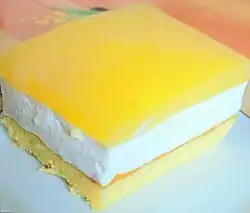 In Slovak and Czech cuisine, šumienkový zákusok (Slovak pronunciation: ['ʂumɪenkɔʋiː 'zaːkusɔk]) or zákusek (Czech pronunciation: ['ʃumɪɛnkoviː 'zaːkusɛk], English: 'effervescent powder dessert')[a] is a summer dessert made from sponge cake (natural or cocoa), whipped cream o tvaroh cream and effervescent powder or instant drink jelly and cream in powder with vanilla flavor. Sometimes fruit compote is added.