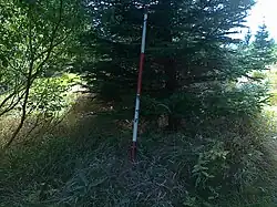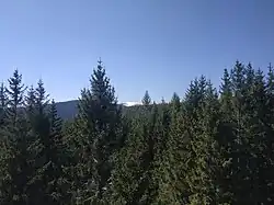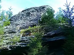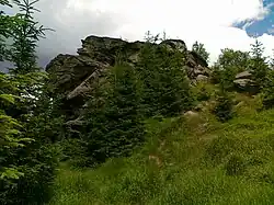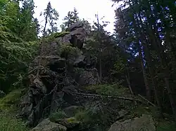 All forestation types are present: spruce forest, mixed coniferous forest[c] and deciduous forest, with spruce forestation definitely dominating.[9][10] The southwestern slope is mostly covered with spruce forest, while the other slopes with decreasing elevation are covered with mixed coniferous forest and deciduous forest in addition to spruce forest.[9][10] On almost all slopes there are glades, firebreaks and slight stubble.[10] At the foot of the eastern slopes, near road No. 445, and the northwestern slopes, near road No. 451, run 22 kV overhead electric transmission lines. The mountain is interspersed with numerous individual rocky outcrops and rock groups found on almost all slopes[3] (including secondary peaks[11] or the so-called Nedělní skála).[12][13][14] In addition, on the western slope at an altitude of 850–915 meters above sea level, there is an area covered with boulders.[3]