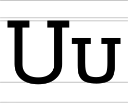 The letter Ʊ (minuscule: ʊ), called horseshoe or sometimes bucket, inverted omega or Latin upsilon, is a letter of the International Phonetic Alphabet used to transcribe a near-close near-back rounded vowel. Graphically, the lower case is a turned small-capital Greek letter omega (Ω) in many typefaces (e.g. Arial, Calibri, Candara, Liberation, Lucida, Noto, Times New Roman), and historically it derives from a small-capital Latin U (ᴜ), with the serifs exaggerated to make them more visible.[1] However, Geoffrey Pullum interpreted it as an IPA variant of the Greek letter upsilon (υ) and called it Latin upsilon, the name that would be adopted by Unicode, though in IPA an actual Greek upsilon is also used for the voiced labiodental approximant; Pullum called this letter script V[2] and Unicode calls it V with hook.