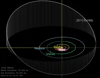 2015 KH162 last came to perihelion around 1930,[3][9] moving away from the Sun ever since and is currently at about 60.6 AU,[7] twice as far from the Sun than Neptune. Its current distance makes it one of the most distant known minor planets in the Solar System (also see List of Solar System objects most distant from the Sun § Known distant objects).[10] In 2415, the object will reach its aphelion at 82.1 AU.[9]
