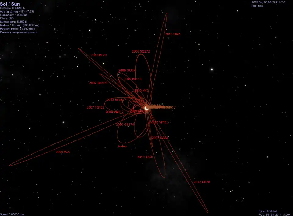 ![]() The orbits of some of the most distant minor planets, 2013 BL76 at top left | |