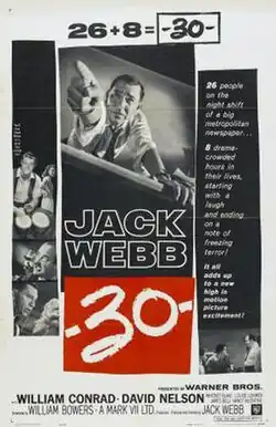 -30- (released as Deadline Midnight in the UK) is a 1959 film directed by Jack Webb and starring Webb and William Conrad as night managing editor and night city editor, respectively, of a fictional Los Angeles newspaper, loosely based on the real-life (and now defunct) Los Angeles Herald-Examiner.[1]