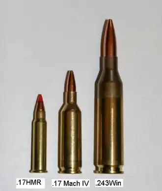 ![]() Left to right: .17 HMR, .17 Mach IV, .243 Win | ||||||||||||