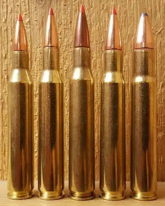 The cartridge was initially commercially loaded to drive a 130 grain (8.4 gram) bullet at approximately 960 m/s (3,140 ft/s), later reduced to 930 m/s (3,060 ft/s), demonstrating a high performance at the time of its introduction while being marketed as a suitable cartridge for big game shooting in the 270 to 460 metres (300 to 500 yd) range. Two additional bullet weights were soon introduced: a 100-grain (6.5 gram) hollow-point bullet for varmint shooting, and a 150 grain (9.7 gram) bullet, offering a higher sectional density, which made it suitable for achieving better penetration for large sized deer, such as wapiti, and moose.[3] However, the 130 grain bullet remains the most popular option.