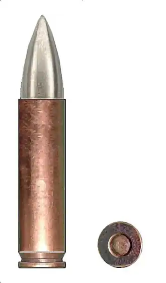 To meet this need, Frank F. Burton of Winchester, developed the "Burton Light Machine Rifle", a selective fire blowback rifle, with selection of rate of fire to be used in observation and surveillance planes, the first practical version of which was ready in 1917.[7][8][9] For this rifle, he adapted the .351 WSL cartridge into a rimless cartridge, firing an incendiary Spitzer bullet, resulting in the .345 Winchester Self-Loading.[1][10]