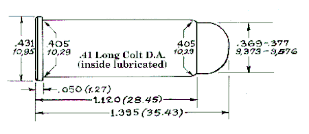 The .41 Long Colt was a lengthened version of the earlier centerfire .41 Short Colt, which was made to duplicate the dimensions of the even earlier .41 Short[1] rimfire. The front of the bullet was about 0.406–0.408" OD, the same as the case. The barrel was about 0.404–0.406" groove diameter. The bullet lubrication was outside the case. At 0.386–0.388" OD, The base of the bullet was smaller in diameter to fit inside the case. This is known as a "heel-base" or heeled bullet. The only modern heeled bullet is the .22 rimfire.
