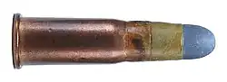 In 1867, the Swiss military adopted the 10.4×38mmR cartridge. As one of the few rimfire cartridges to see military service, the 313 gr (20.3 g) bullet and 1,400 ft/s (430 m/s) was respectable compared to its contemporaries. The most popular arms chambered for this round were the Vetterli series of rifles. This type of round was also used in the 1867 Peabody and the Milbank-Amsler swinging-block conversion rifles.[2][3] Adopted in 1869 along with the Vetterli turn-bolt rifle, it was discontinued, along with the rifle, in 1889. With a 334 gr (21.6 g) bullet, it is adequate for deer, and only at short range.[1]