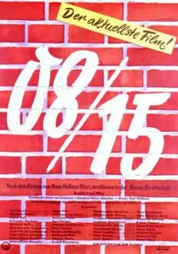 08/15 is a 1954–55 West German film trilogy directed by Paul May and based on the novel 08/15 by Hans Hellmut Kirst who also served as the film's screenwriter (published in English as "The Revolt of Gunner Asch"). The term 08/15 (nill-eight/fifteen, German: Null-Acht/Fünfzehn) refers to the German Army's standard machine gun, the 08/15 (or MG 08 model 15), by far, the most common German machine gun deployed in World War I. It was manufactured in such large quantities that it became the German Army slang for anything that was standard issue.[1]