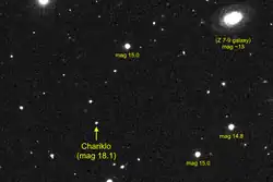 Chariklo was discovered on 15 February 1997 by the University of Arizona's Spacewatch project at Kitt Peak National Observatory.[1] James V. Scotti made the discovery observations using the Spacewatch 0.9-meter telescope,[13][14] although NASA and the Minor Planet Center (MPC) do not mention him as the official discoverer.[3][1][15] Other observatories from Canada, Czech Republic, and China continued observing Chariklo until the discovery was announced by the MPC on 24 February 1997. The MPC gave the provisional designation 1997 CU26 to the object.[13] Chariklo was the seventh centaur discovered.[16]: 457 [d]