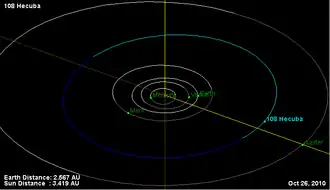 108 Hecuba is a fairly large and bright main-belt asteroid. It was discovered by Karl Theodor Robert Luther on 2 April 1869,[7] and named after Hecuba, wife of King Priam in the legends of the Trojan War in Greek Mythology. This object is orbiting the Sun with a period of 5.83 years and an eccentricity of 0.06. It became the first asteroid discovered to orbit near a 2:1 mean-motion resonance with the planet Jupiter,[8] and is the namesake of the Hecuba group of asteroids.[9]