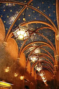 The ceiling above the banking room contains six deep beams, which are actually steel trusses.[11][30] These beams are supported by imitation-stone corbels on the walls, which conceal steel brackets beneath. The ceiling is coated with six layers of materials, giving the impression that it contains coffers and small wooden beams.[30] Six cast-bronze chandeliers are anchored from the ceiling, each of which has three tiers.[29][30] The central lamp was modeled after that of the Hagia Sophia.[11] Originally, the center of the ceiling had a skylight with twelve panels of pale amber glass.[10] The skylight measures 35 by 60 feet (11 by 18 m).[19]