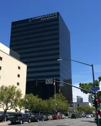 When the building opened in 1971, it was the first all-glass high rise in San Diego. The 18-story building has a bronze plate-glass exterior and can be identified by the Commonwealth Financial Network sign located on the top of the north and west-facing sides.[1]