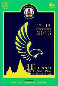 The Chennai International Film Festival (CIFF) was instituted in the year 2003 by the Indo Cine Appreciation Foundation (ICAF), a non-profit organisation.[1] ICAF is a registered film society and works for the promotion of meaningful cinema by organising country centric festivals throughout the year by obtaining films from Embassies and Consulates, and has around 500 members, including film directors, cinematographers and technicians.[2] In 2008, the Government of Tamil Nadu began supporting the event by sponsoring a part of it. The fest was reinvented in 2010 following the involvement of actor-director Suhasini which spiraled the direct involvement of film personalities in coordinating the fest. Later, when the funds raised through well-wishers were not substantial enough to support the event, the state government extended its support and financed the fest with a donation of ₹5 million (US$59,000). Since then, the government has been supporting the subsequent editions of the festival.[1] The fest is conducted every year during the month of December.[3]