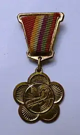 The emblem of the festival was chosen as a result of a competition in 1984 in which more than 200 professional artists from different countries took part. The winning designer of the festival's emblem was People's Artist of Ukraine Rafael Zeynurovich Masautov.[13] The emblem was used in more than 80 countries. In the USSR the emblem of the festival, at the order of the Council of Ministers of the USSR, was used to produce more than 7,000 souvenir items. The emblem brought the USSR a net profit of 450,000,000 Soviet rubles (through surcharges for products with festival symbols).