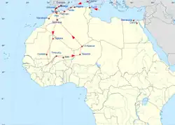 In addition to invasions on the Iberian Peninsula, the Marinids wanted to control the central Maghreb and Ifriqiya. Their first attacks were against the Abdalwadids of Tlemcen, the Marinids immediate neighbours to the east, whom they invade several times.[15] In 1337 Abū al-Ḥasan ʿAlī, one of the Marīnid sultans, tried to restore the Almonad empire. He captured the Tunisia capital of Tilimsān (Tlemcen) but was unable to defeat the Ḥafṣid.[14] But in 1347, Abu-l-Hasan 'Ali ibn 'Uthman also captured Tunis and the Hafsid amir.[15] He later also captured Barqa and Tarablus. During this time the Marinids united all of the Maghrib under one government. This expansion was temporary because the following year, Abu-l-Hasan 'Ali ibn 'Uthman's army was defeated in Kairouan by a coalition of Arab tribes. Eventually, the Near Maghrib and the Middle Maghrib seceded from the Marinid state when weak rulers rose to power causing it to return to its original borders.[13] These military campaigns depleted the resources of the Marinid dynasty and led to a state of anarchy.