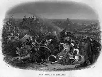 On the 17th of February 1843, as part of Sir Charles Napier's advance guard of his expeditionary force to conquer the province of Scinde, the Scinde Horse came across the forward elements of the combined forces of the Waziri tribals of Sind, led by Mir Nuseer Khan, entrenched in the Fulaillee Nala, near Meeanee, 23 miles ahead of Hyderabad, the capital town of Sind. Along with the Scinde Horse, there were amongst others, 5 Raj Rif (Napiers Rifles), the Cheshire Regiment and the Poona Horse, bringing up the rear, with the Madras Engineers providing engineering support. Not to be deterred, the regiment reconnoitred the area and made an outflanking move through dense forest and broken country, most unsuitable for horses. In an unparalleled outflanking manoeuvre in which over 70 horses died of fatigue, the Scinde Horse surprised the enemy by appearing at their rear and routed them in a cavalry charge, capturing the principal standard of Mir Nuseer Khan in the process. Seeing their Standard captured, the enemy capitulated and Sind was conquered. Sir Charles Napier cryptically signalled back "Pecavi" (I have Sinned (Sind)).[3][4]