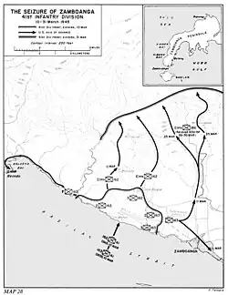 After leaving Biak, the 162nd and the division staged at Mindoro in preparation for the liberation of the Southern Philippines. The 186th Regimental Combat Team landed on Palawan on 28 February in order to secure airfields there from which the Japanese lines of communication in the South China Sea could be blockaded. To capture airfields even closer to the Dutch East Indies and the strategic oilfields of Borneo, planners selected the southern tip of the Zamboanga Peninsula on Mindanao as the next target.[7] The rest of the 41st Infantry Division was committed to this operation, and entered Basilan Strait early on 10 March. The invasion beaches had been targeted by three days of naval bombardments which had disabled some of the Japanese artillery inland.[8] For the Mindanao operations, the 205th Field Artillery Battalion was organic to the 162nd RCT to provide direct support.[9] The 162nd Infantry was tasked with assaulting the beach near the barrio of San Mateo, but faced very little resistance from the Japanese. The leading assault wave, touching down around 0915, was faced with light machine gun fire and subsequent troops encountered artillery and mortar fire from the high ground inland, but the regiment suffered no casualties. The 162nd secured the abandoned landing strip of Wolfe Field half a mile inland and spread out in an advance in all three directions outwards from the beachhead. The 163rd Infantry followed within twenty minutes and within several hours had begun advancing directly east on Zamboanga City. Before halting at nightfall, the 162nd advanced 1.5 miles inland and the same distance to the west along the southern coast of the peninsula. By dusk on 11 March, both regiments secured the coastal plain, as the Japanese 54th Independent Mixed Brigade and the rest of the nearly 9,000 Japanese troops on the peninsula had withdrawn to defensive positions on the high ground 2–3 miles inland, from which they could observe the American troops on the beachhead. To the northwest, the advance of the 162nd reached the former Japanese seaplane base of Caldera Bay, while on the inland axis the regiment advanced two miles inland to Malisay and to San Roque a mile and a half southeast of Malisay. The 163rd secured the rubble of Zamboanga City, destroyed in preinvasion bombardment, and captured San Roque Airfield, which was quickly repaired to serve as an airstrip.[8]