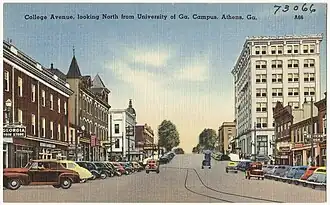 ![]() Looking north from the University of Georgia campus at the foot of College Avenue, around 1935. 170 College Avenue is on the right, after the Western Union sign | |