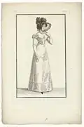 Women also began to wear caps known as a cornette around 1816. These caps were tied under the chin and worn indoors. They also tended to be greatly adorned with plumes, ribbons, flowers, and jewels. Another alternative to the cornette was the turban, also often bejeweled and adorned, which shows the great interest in exotic cultures.[4]