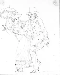 The fashionable shoe was a flat slipper. In the late 1820s, the first high shoe appeared and became vogue for both men and women. The shoe typically consisted of a three-inch high cloth top that laced on the inner side and a leather vamp that supported a long, narrow, and squared toe.[5]