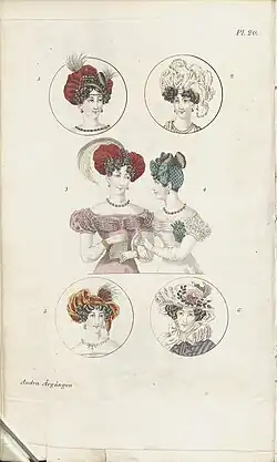 Women also began to wear caps known as a cornette around 1816. These caps were tied under the chin and worn indoors. They also tended to be greatly adorned with plumes, ribbons, flowers, and jewels. Another alternative to the cornette was the turban, also often bejeweled and adorned, which shows the great interest in exotic cultures.[4]
