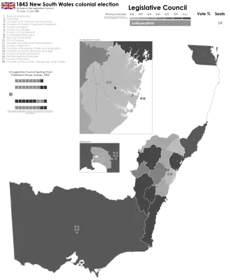 The 1843 New South Wales colonial election was held between 15 June and 3 July 1843 and was Australia's first colonial election. This election was for 24 seats in the New South Wales Legislative Council and it was conducted in 15 single-member constituencies, two 2-member constituencies and one 5-member constituency, all with a first past the post system. This included 6 members in what became the Colony of Victoria and a single member for the coast north of Newcastle.[1] The Legislative Council was a hybrid system with 36 members, 24 elected, 6 appointed by virtue of their office (Colonial Secretary, Colonial Treasurer, Auditor-General, Attorney General, Commander of the forces and Collector of Customs)[2] and 6 nominated. The appointments and elections were for five year terms.[3][4][5][6]