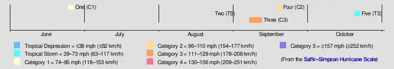 The 1854 Atlantic hurricane season featured five known tropical cyclones, three of which made landfall in the United States. At one time, another was believed to have existed near Galveston, Texas, in September.[1] However, HURDAT – the official Atlantic hurricane database – now excludes this system.[2] The first system, Hurricane One, was initially observed on June 25. The final storm, Hurricane Five, was last observed on October 22. These dates fall within the period with the most tropical cyclone activity in the Atlantic. No tropical cyclones during this season existed simultaneously. One tropical cyclone has a single known point in its track due to a sparsity of data.
