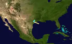 Reports first indicated a hurricane in the Gulf of Mexico on September 18, while centered about 110 mi (175 km) south-southwest of Cameron, Louisiana. The storm drifted west-northwestward with winds of 105 mph (165 km/h), equivalent to a Category 2 hurricane.[2] The lowest barometric pressure estimate was 965 mbar (28.5 inHg).[3] At 2100 UTC on September 18, the storm made landfall near Freeport, Texas, at the same intensity. It weakened to a Category 1 hurricane early on the following day. The system further weakened to a tropical storm at 1200 UTC on September 19. Re-curving northeastward, the storm persisted until dissipating over eastern Texas on September 20.[2]