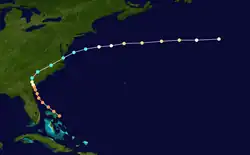 The barque Southerney observed a tropical storm on October 20,[1] while located about 460 mi (740 km) north-northwest of San Juan, Puerto Rico. The storm strengthened slowly while heading northward, until peaking with winds of 70 mph (110 km/h) on October 21. The storm then began to re-curve northeastward. Early on October 22, it passed near Bermuda,[2] though no impact was reported on the island.[1] Several hours later, this system was last noted about 365 mi (585 km) east-northeast of Bermuda.[2]