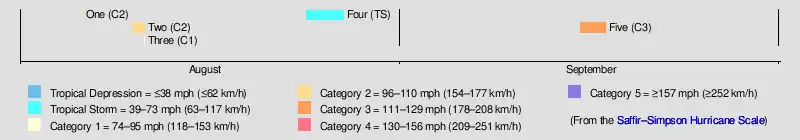 Five | September 15–17 | Category 3 hurricane | 125 (205) | 945 | Gulf Coast of the United States (Louisiana) | Unknown | 1 | [12] | ||