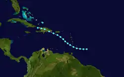 Based on reports of a strong gale,[5] a tropical storm was first tracked about 250 mi (400 km) east-southeast of Barbados early on August 24. It initially headed westward, before re-curving west-northwestward early on the following day. Shortly thereafter, the storm passed through the Windward Islands between Grenada and Saint Vincent and the Grenadines. The storm peaked with winds of 70 mph (110 km/h) while moving northwestward across the Caribbean Sea. It weakened slightly before making landfall near San Pedro de Macorís, Dominican Republic, with winds of 60 mph (95 km/h) early on August 27. The storm slowly weakened over Hispaniola and was last noted near Bombardopolis, Haiti, later that day.[2]