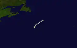 A Category 2 hurricane was first encountered by the ship Francis B. Cutting about 630 mi (1,010 km) south-southeast of Cape Race, Newfoundland, on August 8.[3][5] With winds estimated at 105 mph (165 km/h), the storm weakened to a Category 1 hurricane several hours later as it tracked northeastward. The cyclone was last noted late on August 9.[5]