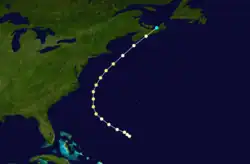A tropical storm was initially encountered near the Lesser Antilles on September 9 by the ship Frank W.. Later that day, the ship Mary Ann was dismasted.[3] It is estimated that the cyclone intensified into a Category 1 hurricane around 12:00 UTC on September 9, with winds reaching 80 mph (130 km/h). The system moved north-northwestward or northward for several days and closely approached Bermuda late on September 11.[5] Around that time, some ships to the southeast of the island were damaged during the storm and put into Bermuda as a result.[3] By early on September 13, the hurricane was beginning to move in a more northeasterly direction.[5] The bark Machae was dismasted on September 14.[3] The cyclone weakened to a tropical storm early the following day.[5] On September 16, the Glad Tiding last observed the storm about halfway between Newfoundland and Ireland.[3]
