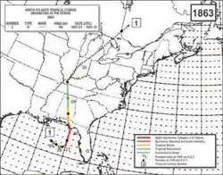 The 1863 Atlantic hurricane season featured five landfalling tropical cyclones. In the absence of modern satellite and other remote-sensing technologies, only storms that affected populated land areas or encountered ships at sea were recorded, so the actual total could be higher. An undercount bias of zero to six tropical cyclones per year between 1851 and 1885 has been estimated.[1] There were seven recorded hurricanes and no major hurricanes, which are Category 3 or higher on the modern day Saffir–Simpson scale.[2] Of the known 1863 cyclones, seven were first documented in 1995 by José Fernández-Partagás and Henry Diaz,[3] while the ninth tropical storm was first documented in 2003.[4] These changes were largely adopted by the National Oceanic and Atmospheric Administration's Atlantic hurricane reanalysis in their updates to the Atlantic hurricane database (HURDAT), with some adjustments.