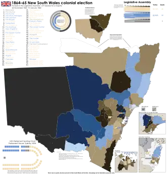 The 1864–65 New South Wales colonial election was held between 22 November 1864 and 10 January 1865. This election was for all of the 72 seats in the New South Wales Legislative Assembly and it was conducted in 52 single-member constituencies, six 2-member constituencies and two 4-member constituencies, all with a first past the post system.[3] The previous parliament of New South Wales was dissolved on 10 November 1864 by the Governor, Sir John Young, on the advice of the Premier, James Martin. Suffrage was limited to adult white males.