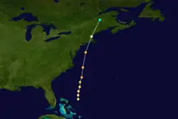 The final hurricane of the season was first observed on October 4 by a ship off the southeast coast of North Carolina. With winds estimated at 105 mph (169 km/h), the storm tracked northeastward, passing just east of Martha's Vineyard before moving across Cape Cod late on October 4.[2][8] As it moved along the coast, the storm produced heavy precipitation, reaching 12.25 in (311 mm) in Canton, Connecticut.[16] The strongest winds did not affect Massachusetts, although a few hours later the hurricane struck just east of Portland, Maine at peak intensity.[2][8] This made it one of six storms to produce hurricane-force winds in Maine, along with Hurricane Carol in 1953, Hurricane Edna in 1954, Hurricane Donna in 1960, Hurricane Gerda in 1969, and Hurricane Gloria in 1985.[9] In Maine, the high rainfall caused widespread flooding, while the high winds destroyed at least 90 houses.[16] The hurricane quickly weakened over land, and after turning northeastward into Atlantic Canada dissipated on October 5 near the Gulf of St. Lawrence.[8]
