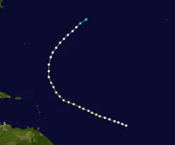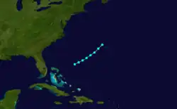A ship about halfway between South America and Cape Verde reported a hurricane on September 11. The storm tracked generally west-northwestward, affecting several other ships with damaging winds. On September 15, a ship traveling from St. Thomas to England encountered the hurricane and observed a minimum barometric pressure of 979 mbar (28.9 inHg);[4][2] this suggested peak winds of 105 mph (169 km/h).[8] By September 16 the hurricane had weakened slightly as its track turned to the north and northeast. It was last observed on September 18 to the west of the Azores as a tropical storm.[4]