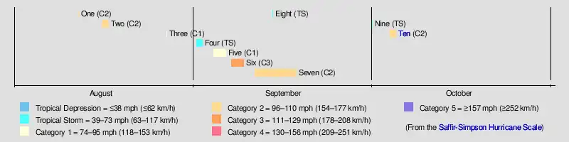 The 1869 Atlantic hurricane season was the earliest season in the Atlantic hurricane database in which there were at least ten tropical cyclones.[1] Initially there were only three known storms in the year, but additional research uncovered the additional storms.[2] Meteorologist Christopher Landsea estimates up to six storms may remain missing from the official database for each season in this era, due to small tropical cyclone size, sparse ship reports, and relatively unpopulated coastlines.[3] All activity occurred in a three-month period between the middle of August and early October.