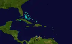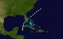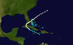 Based on reports from contemporary Cuban meteorologists, a tropical storm was first observed in the Caribbean just south of Haiti's Tiburon Peninsula on October 5.[3][23] The storm moved west-northwestward and intensified into a hurricane south of Cuba on the following day. Thereafter, the cyclone rapidly strengthened further and likely peaked as a Category 3 hurricane with maximum sustained winds of 115 mph (185 km/h) prior to making landfall in the Ciénaga de Zapata municipality of Cuba's Matanzas Province on October 7. After crossing Cuba, the hurricane moved slowly northeastward through the Straits of Florida, tracking close to the Florida Keys as a Category 2 hurricane for a few days. The storm then struck Grand Bahama and the Abaco Islands in the Bahamas early on October 12 while still a Category 2 hurricane, but soon weakened to Category 1 status. It moved out to sea, last being seen west of Bermuda on October 14.[3]